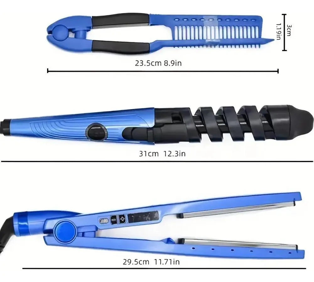 Transforma tu rutina de belleza con el Kit Plancha, Rizador y Peine Térmico Profesional, el set ideal para lograr cualquier estilo: alisado, ondas o rizos definidos.